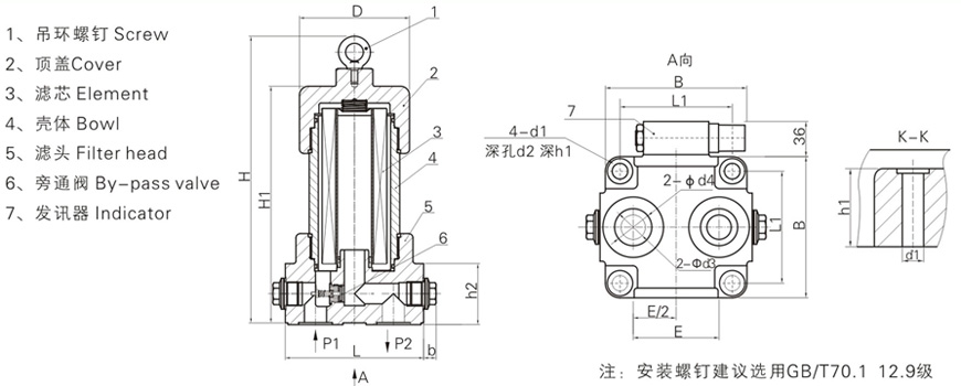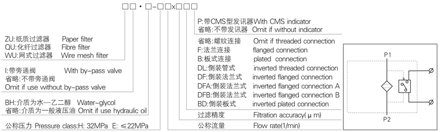 注:*為過(guò)濾精度,#為過(guò)濾材料,若使用介質(zhì)為水—乙二醇,濾材為紙質(zhì),帶發(fā)訊器和旁通閥,則過(guò)濾器型號為:ZUI·BH—H63×*P,濾芯型號為HX·BH-63×*濾材為化纖,帶發(fā)訊器,則過(guò)濾器型號為:QU·BH-63×*P, 濾芯型號為:HX·BH-63×*Q,濾材為金屬網(wǎng),帶發(fā)訊器,則過(guò)濾型號為:WU-H63×*P,濾芯型號為:HX-63×*W