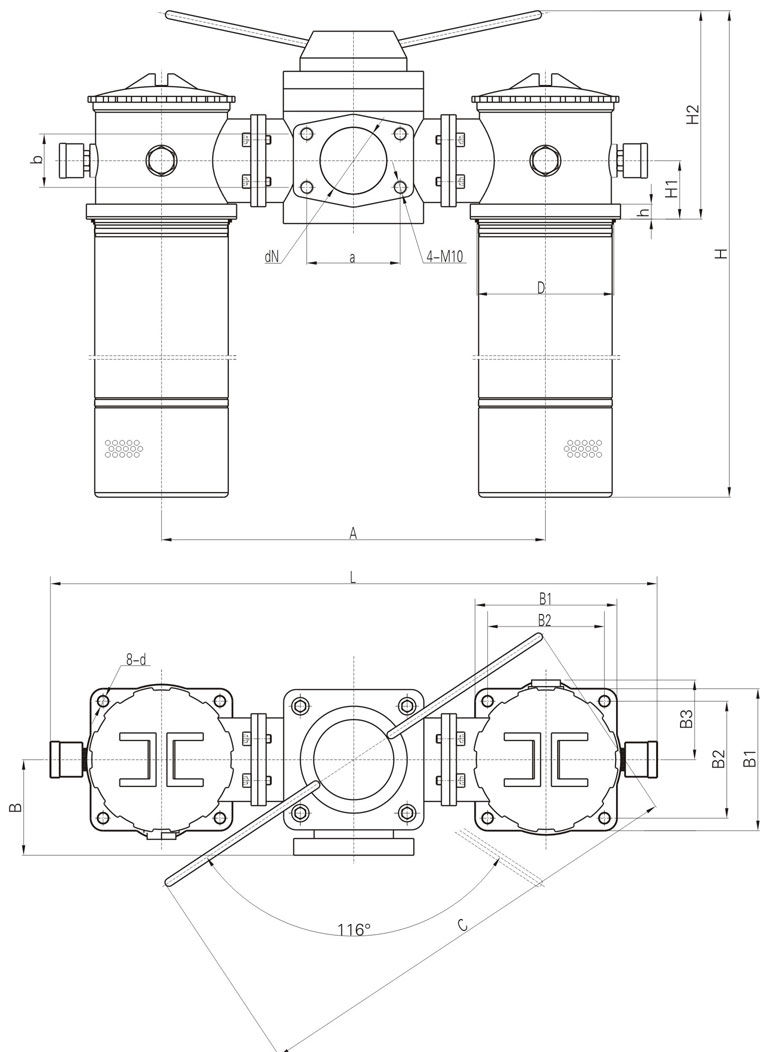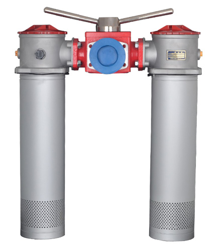 當一只過(guò)濾器的濾芯堵塞致使進(jìn)出口壓差為0.35MPa時(shí),發(fā)訊器發(fā)訊,這時(shí),轉動(dòng)換向閥,使備用濾油器工作,然后更換已堵塞的濾芯。