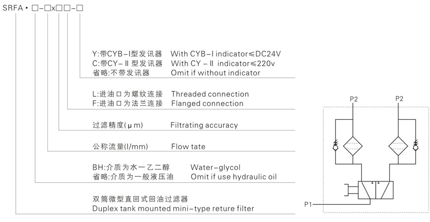 注:*為過(guò)濾精度,若使用介質(zhì)為水一乙二醇,帶發(fā)訊器,則過(guò)濾器型號為:SRFA·BH-63x*L-Y,濾芯型號為SFAX·BH-63x*。