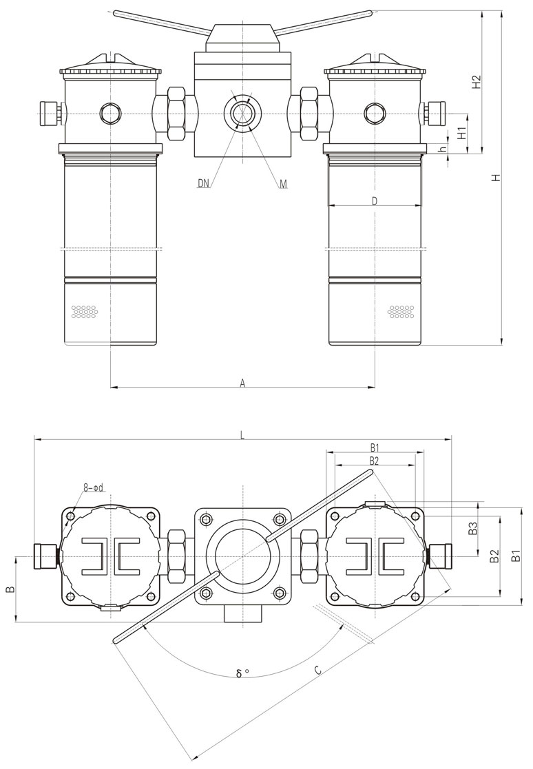 DN | M | H1 | B | B1 | B2 | B3 | d | A | D | L | H | H2 | C | h | δ | |