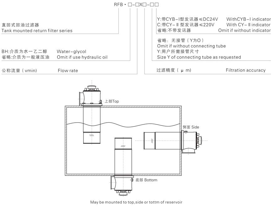 RFB型系列直回式回油過(guò)濾器用于液壓系統回油精過(guò)濾,濾除液壓系統中由于元件磨損產(chǎn)生的金屬顆粒,以及密封件磨損的橡膠雜質(zhì)等污染物,使流回油箱的油液保持清潔。