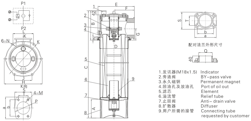 6、具有目測指示和電發(fā)訊二合一發(fā)訊裝置、溢流管、積污盅;當濾芯逐步堵塞后,可在目測表上觀(guān)察濾芯堵塞情況,同時(shí)還可接電發(fā)訊(發(fā)訊值為0.35MPa)。在濾芯底部設置溢流管及積污盅,更換濾芯時(shí)可隨同一起帶出,從而避免了污染物重新掉入油箱內的現象。